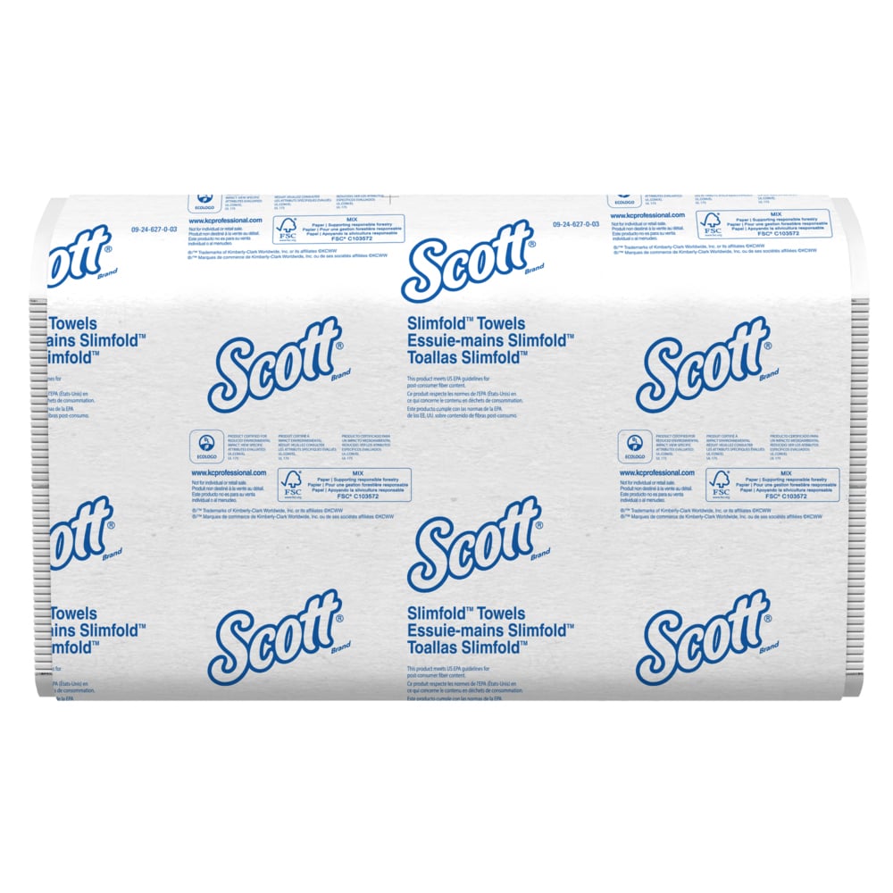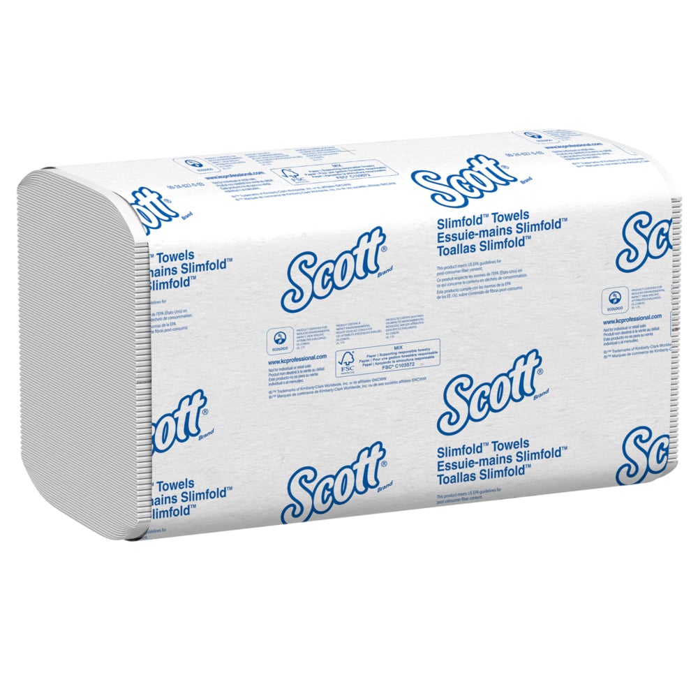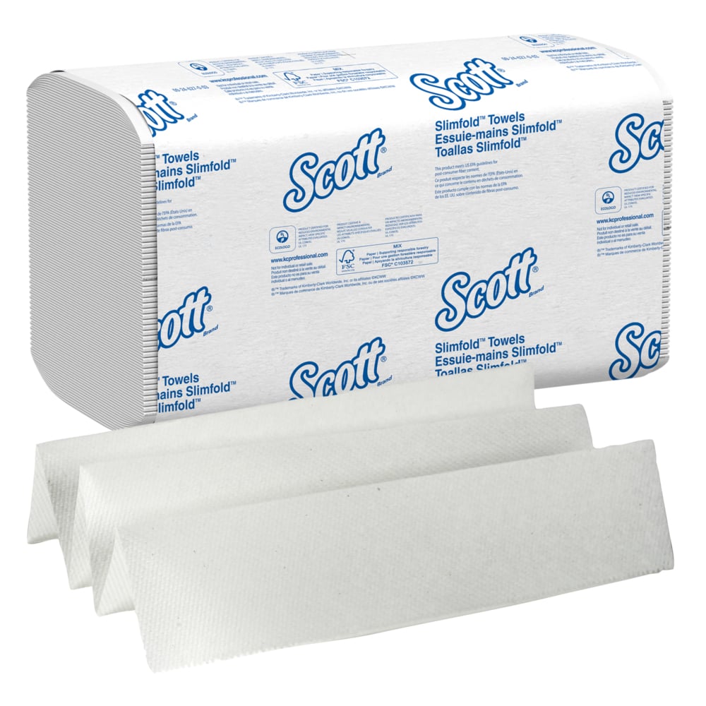 Scott® provides enhanced hygiene solutions for critical environments. Sometimes the littlest things make the biggest difference. With Scott® Slimfold Paper Towels, the innovative design means that you can fit premium paper towels in places you may have never thought possible. Now, thanks to a smart fold design (it’s smaller than typical m fold, c fold or tri fold hand towels) you can fit a compatible slim dispenser in tight places like a nurses’ station, a small classroom washing area, or a behind-the-counter sink at your business. These Scott® high-performance towels feature exclusive Absorbency Pockets (fast-drying ridges deliver better absorbency) and are folded five times instead of two (like many multi-folds). Don’t let the small fold size fool you, though: each towel unfolds to 7.5″ x 11.6″, giving you enough towel to get the job done. Find a compatible Kimberly-Clark Professional™ dispenser, which will help keep your towels clean prior to use and deliver one-at-a-time dispensing for hygienic hand drying (only touch the towel you use). Thanks to the slim size there’s also reduced packaging size, which allows for easy storage of extra towels in cabinet or closets – without the need for bulky boxes. Scott® Slimfold Paper Towels provide superior hand-drying performance and user satisfaction – it’s the name that says premium quality and homelike comfort, no matter how much space you have.